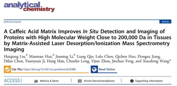 新聞網訊 近日,我校生命與環境科學學院(質譜成像與代謝組學國家民委重點實驗室)王曉東教授團隊在MALDI-MSI蛋白質原位檢測及成像表征新型基質研究領域取得了又一重要進展。相關研究成果以“A Caffeic Acid Matrix Improves In Situ Detection and Imaging of Proteins with High Molecular Weight Close to 200,000 Da in Tissues by Matrix-Assisted Laser Desorption/Ionization Mass Spectrometry Imaging”為題,發表在分析化學頂級期刊《Analytical Chemistry》(Nature Index收錄)上,該研究論文同時被遴選為期刊封面文章。中央民族大學為該論文第一作者單位及唯一通訊單位。論文在線鏈接:https://pubs.acs.org/doi/10.1021/acs.analchem.0c05480。
