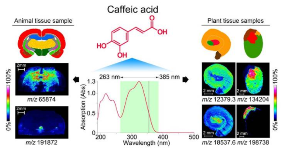王曉東教授團隊通過系統研究發現咖啡酸(caffeic acid, CA)作為一種綠色、無毒有機酸基質可顯著增強MALDI-MSI對生物組織樣本中HMW蛋白質的原位檢測及成像表征性能。研究表明:該基質具有離子化效率高、微米級結晶尺寸、共結晶形態均一性好、化學穩定性強、線性動態范圍寬等特點,且同時適用于動/植物組織樣本表面HMW蛋白質的檢測及成像。研究結果顯示基于CA基質MALDI-MSI對動/植物組織樣本蛋白質的原位檢測質量上限高達~200,000 Da,遠高于目前常用的蛋白質檢測基質芥子酸(sinapinic acid, SA)和阿魏酸(ferulic acid, FA)。研究團隊利用該基質分別對小鼠腦、馬檳榔種子和萌發大豆種子組織成功進行了HMW蛋白質原位檢測與成像研究,極大拓展了MALDI-MSI技術在原位蛋白質組學研究中的應用范圍。值得注意的是,該研究首次從眾多HMW蛋白質離子信號中成功鑒定出小鼠腦kinesin-like蛋白(KIF1A)、馬檳榔甜蛋白II(mabilin-2)和馬檳榔甜蛋白IV(mabilin-4)、β-伴大豆球蛋白(β-conglycinin)三聚體(αα′β),充分證實了利用CA在組織上原位研究HMW蛋白質及蛋白質復合體組織空間分布的可行性及潛在價值。這項研究表明CA有潛力成為一種標準有機酸MALDI基質廣泛用于增強動/植物組織中HMW蛋白質MSI分子成像,拓展人們對于HMW蛋白質組織空間分布形式的系統認識。