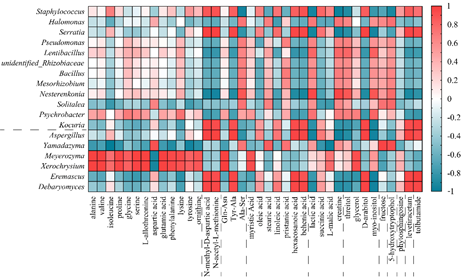 高通量測(cè)序研究表明,老窩火腿的微生物組成十分豐富,共發(fā)現(xiàn)502個(gè)屬的細(xì)菌和28個(gè)屬的真菌,其中核心細(xì)菌屬Lentibacillus和Mesorhizobium以及核心真菌屬Eremascus和Xerochrysium是首次在發(fā)酵肉制品中發(fā)現(xiàn)的(圖2)。采用GC-TOF-MS和UPLC-QTOF-MS進(jìn)行代謝組學(xué)研究顯示,不同發(fā)酵時(shí)間(1年、2年、3年)的老窩火腿在代謝成分方面存在顯著差異,分別鑒定了27和30種差異代謝物,差異代謝物與不同發(fā)酵時(shí)間老窩火腿的風(fēng)味有關(guān),從而驗(yàn)證了當(dāng)?shù)厝说膫鹘y(tǒng)知識(shí)具有科學(xué)內(nèi)涵。此外,并未發(fā)現(xiàn)真菌毒素的存在,卻發(fā)現(xiàn)一些具有藥理活性的化合物(如抗癲癇劑levetiracetam)。研究結(jié)果支持了食用老窩火腿的安全性和藥食同源性。Pearson相關(guān)系數(shù)關(guān)聯(lián)性分析表明,火腿中的微生物能夠促進(jìn)風(fēng)味活性代謝成分的生成(圖3),由此說(shuō)明當(dāng)?shù)厝说膫鹘y(tǒng)智慧——微生物有利于火腿良好風(fēng)味的形成,提供了科學(xué)依據(jù)。