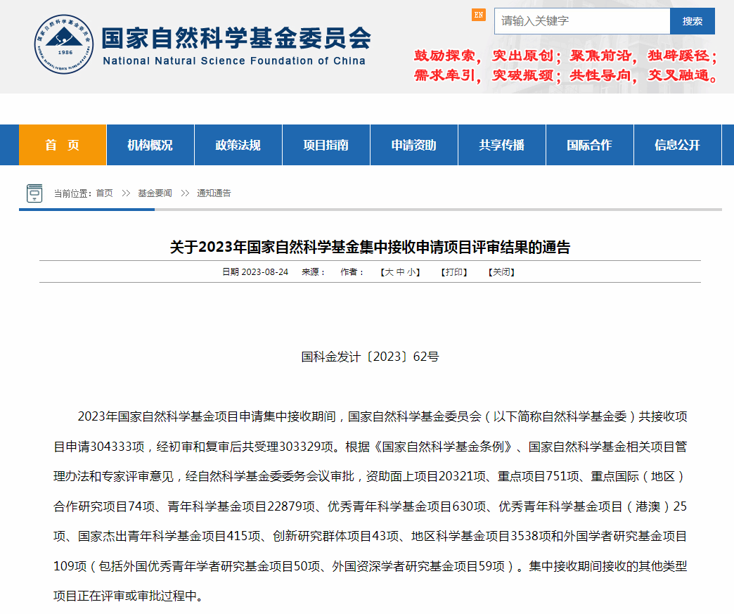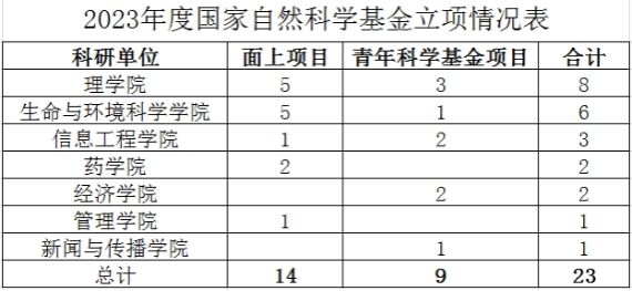 新聞網訊 8月24日,國家自然科學基金委員會正式公布了2023年國家自然科學基金集中接收申請項目評審結果。學校理學院、生命與環境科學學院、信息工程學院、藥學院、經濟學院、管理學院、新聞與傳播學院7個學院共獲資助基金項目23項,其中面上項目14項、青年科學基金項目9項。