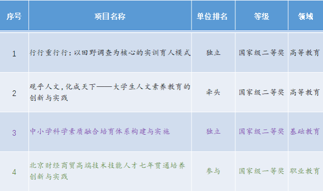 此輪教育教學成果獎評選中,共獲得國家級獎項4項,北京市級獎項13項。其中,在高等教育領域獲得國家級二等獎2項,北京市一等獎5項、二等獎7項;在基礎教育領域獲得國家級二等獎1項、北京市二等獎1項。另外,在職業教育領域,作為參與單位獲得國家級一等獎1項。