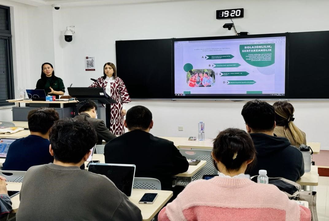 新聞網(wǎng)訊 10月28日,塔什干國立東方大學(xué)烏斯馬諾娃·沙依拉教授與莎赫斯塔洪·沙姆謝耶娃副教授應(yīng)邀在中央民族大學(xué)豐臺校區(qū)日新樓作題為“烏茲別克斯坦文化思維模式”的學(xué)術(shù)講座。講座由外國語學(xué)院院長吳澤慶主持,副院長古麗巴努木·克拜吐里進行了現(xiàn)場翻譯。來自外國語學(xué)院、中國少數(shù)民族語言文學(xué)學(xué)院、哲學(xué)與宗教學(xué)學(xué)院等多個學(xué)院的本科生和研究生到場參加講座學(xué)習(xí)。
