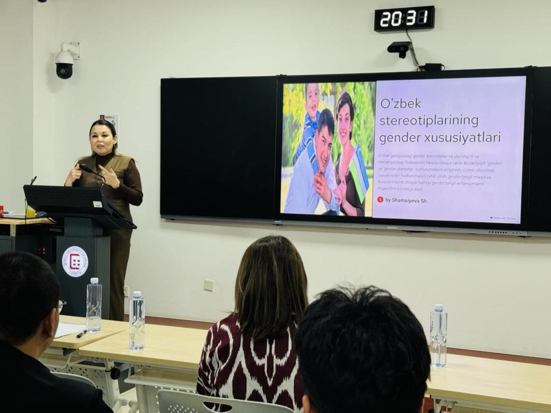烏斯馬諾娃·沙依拉向同學(xué)們介紹了烏茲別克斯坦文化的定型印象,中國人眼中的烏茲別克文化印象。她首先為大家解釋了“定型”這一專業(yè)術(shù)語的概念,之后從不同文化角度講解了烏茲別克斯坦文化定型特點,用生動的例子呈現(xiàn)了烏茲別克斯坦文化中的民族觀念、傳統(tǒng)習(xí)俗及其變化。