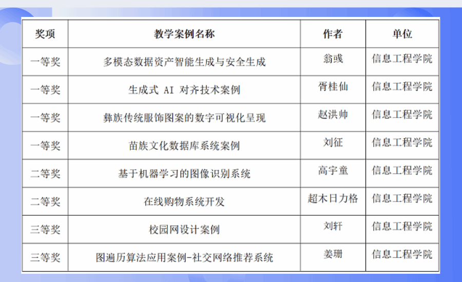 第三屆全國(guó)高校計(jì)算機(jī)課程思政教學(xué)案例設(shè)計(jì)大賽由教育部計(jì)算機(jī)課程思政虛擬教研室主辦,桂林電子科技大學(xué)承辦,大賽共收到來(lái)自全國(guó)58所高校的200多件作品。其中,我校“多模態(tài)數(shù)據(jù)資產(chǎn)智能生成與安全生成”“生成式AI對(duì)齊技術(shù)案例”“彝族傳統(tǒng)服飾圖案的數(shù)字可視化呈現(xiàn)”及“苗族文化數(shù)據(jù)庫(kù)系統(tǒng)案例”等作品,憑借豐富思政內(nèi)涵、創(chuàng)新教學(xué)方法和較好的教學(xué)效果榮獲大賽一等獎(jiǎng),展示了學(xué)校在計(jì)算機(jī)科學(xué)與技術(shù)領(lǐng)域的教學(xué)水平和在人工智能賦能思政教育融入課程教學(xué)方面的成效。