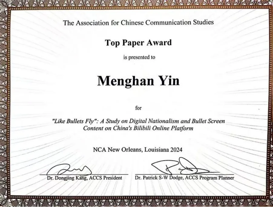 第110屆全美傳播學(xué)會(National Communication Association,NCA)年會于今年11月在美國新奧爾良市舉行,大會主題是“Communication for Greater Regard”。尹夢涵提交的論文“‘Like Bullets Fly’: A Study on Digital Nationalism and Bullet Screen Content on China's Bilibili Online Platform”(“像子彈飛”:中國Bilibili網(wǎng)站上基于彈幕內(nèi)容的網(wǎng)絡(luò)民族主義研究)榮獲NCA所屬的中國傳播研究協(xié)會(The Association of Chinese Communication Studies)頒發(fā)的最佳論文獎(Top Paper Award)。該項研究主要討論了B站用戶消費民族主義的情感表達方式,研究發(fā)現(xiàn)B站用戶的話語表達體現(xiàn)了網(wǎng)絡(luò)語言和官方語言的協(xié)商與合流,平臺成為勾連地方性的情感共同體與政治共同體的“中間地帶”。