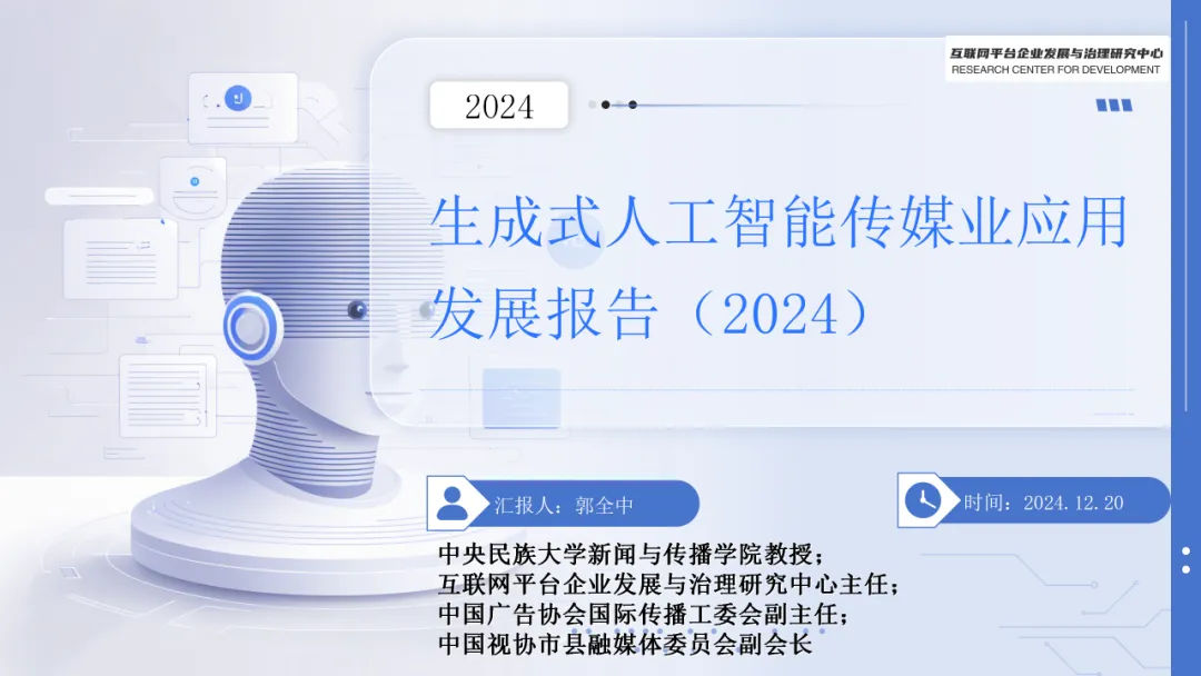 在主題分享階段,新聞與傳播學(xué)院教授郭全中匯報(bào)了《生成式人工智能傳媒業(yè)應(yīng)用發(fā)展報(bào)告(2024)》,報(bào)告從大模型的發(fā)展情況、傳媒業(yè)大模型的應(yīng)用情況、大模型治理以及傳媒業(yè)大模型的未來(lái)展望四部分展開梳理,在掃描大模型投融資、監(jiān)管情況與技術(shù)前沿的基礎(chǔ)上,指出生成式AI給傳媒業(yè)帶來(lái)三重變革——"生產(chǎn)、生態(tài)、營(yíng)銷",結(jié)合方正電子、拓爾思、傳播大腦、人民日?qǐng)?bào)、新華社等案例呈現(xiàn)AI技術(shù)與傳媒實(shí)踐的有效結(jié)合與雙向賦能,提出并多維闡釋了平衡發(fā)展與管理的Gen AI管理新理念——“敏捷治理”理念,強(qiáng)調(diào)更具自適應(yīng)、包容性和可持續(xù)性的管理理念。