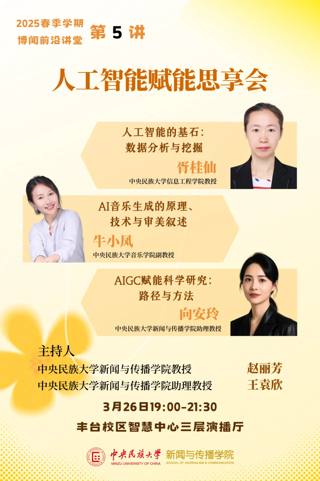 新聞網訊 3月26日晚,由新聞與傳播學院舉辦的2025春季學期博聞前沿講堂第5講暨第一期“人工智能賦能思享會”在豐臺校區演播廳舉行。信息工程學院教授胥桂仙、音樂學院副教授牛小鳳、新聞與傳播學院助理教授向安玲先后登臺,以跨界視角揭秘AI技術邏輯,暢談未來應用圖景。各學院百余名師生現場參與。