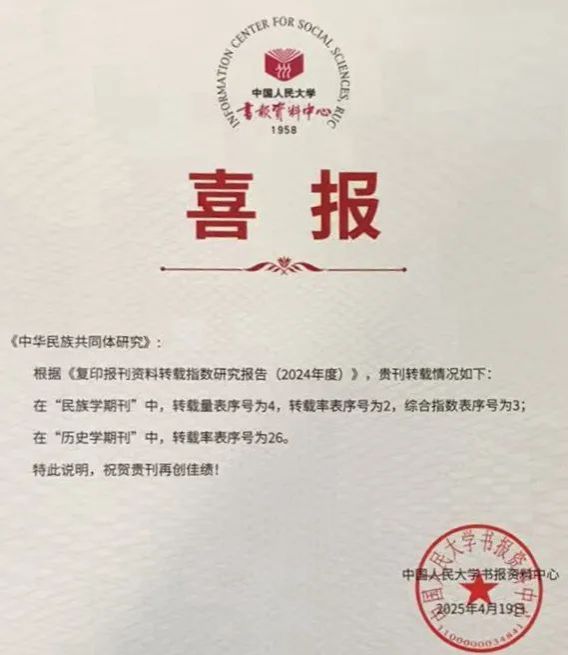 新聞網(wǎng)訊 4月19日,“2025年復(fù)印報刊資料轉(zhuǎn)載指數(shù)發(fā)布暨預(yù)印本平臺建設(shè)論壇”發(fā)布《復(fù)印報刊資料轉(zhuǎn)載指數(shù)研究報告(2024年度)》,《中華民族共同體研究》在多項排名中躋身前列。