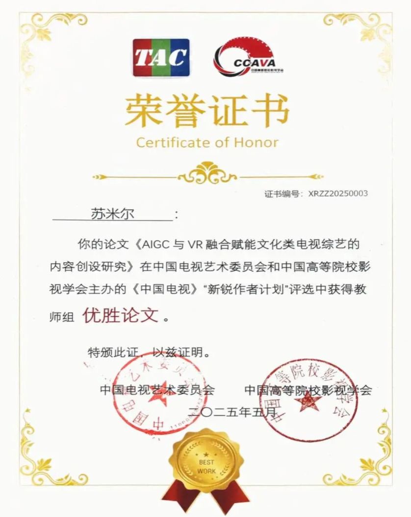 新聞網訊 5月15-18日,由中國電視藝術委員會和中國高等院校影視學會共同推出的“《中國電視》新銳作者計劃”發布交流會暨首屆中國影視青年學者學術沙龍在西北師范大學舉行。中央民族大學新聞與傳播學院青年教師蘇米爾助理教授榮獲“新銳學者”榮譽,其參選論文《AIGC與VR融合賦能文化類電視綜藝的內容創設研究》獲“優勝論文”獎項。