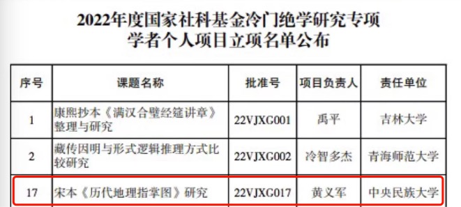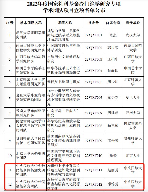 新聞網(wǎng)訊 近日,國家哲學(xué)社會科學(xué)規(guī)劃辦公室發(fā)布2022年度國家社科基金冷門絕學(xué)研究專項立項名單,12個學(xué)術(shù)團隊項目、63項學(xué)者個人項目獲批立項。我校趙麗芳教授領(lǐng)銜的“少數(shù)民族新聞傳播史研究團隊”的團隊項目《20世紀上半葉喜馬拉雅地區(qū)境外藏文報刊整理研究與數(shù)字化》、李錦芳教授領(lǐng)銜的“壯侗語族研究團隊”的團隊項目《瀕危仡央語支的深度調(diào)查與語言文化資源數(shù)字化》以及黃義軍教授負責(zé)的個人項目《宋本〈歷代地理指掌圖〉研究》獲批。
