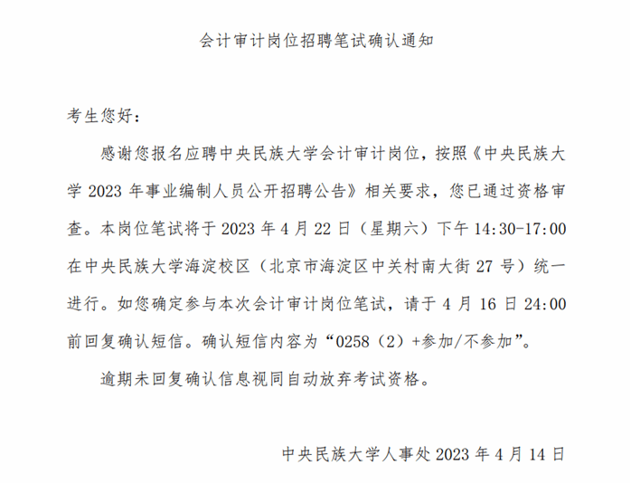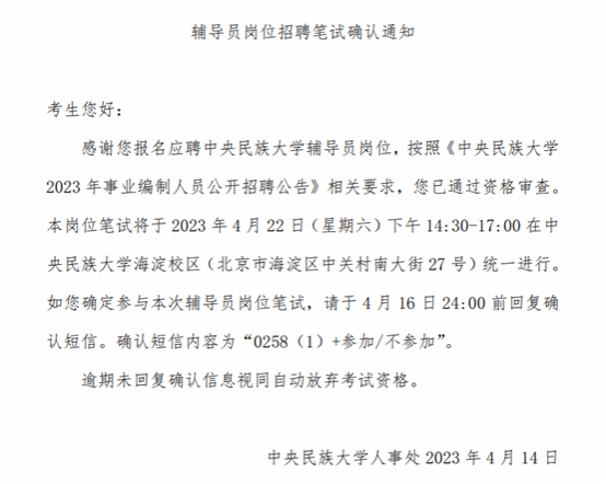 準考證下載時間:2023年4月20日10:00至4月21日22:00,期間請考生登錄中央民族大學招聘網(http://zhaopin.muc.edu.cn/product/recruit/website/RecruitIndex.jsp?FM_SYS_ID=zymzdx_v8)查詢準考證相關事宜。