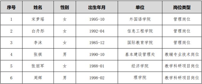 根據《中央民族大學非事業編制崗位合同制職工聘用管理辦法》(2014[38]號)的規定,學校于2023年6月30日面向社會發布了《中央民族大學2023年非事業編制合同制職工招聘公告》,經個人報名、資格審核、筆試和面試等程序,學校擬聘用宋夢瑤等6人為校聘非事業編制合同制職工,現予以公示。