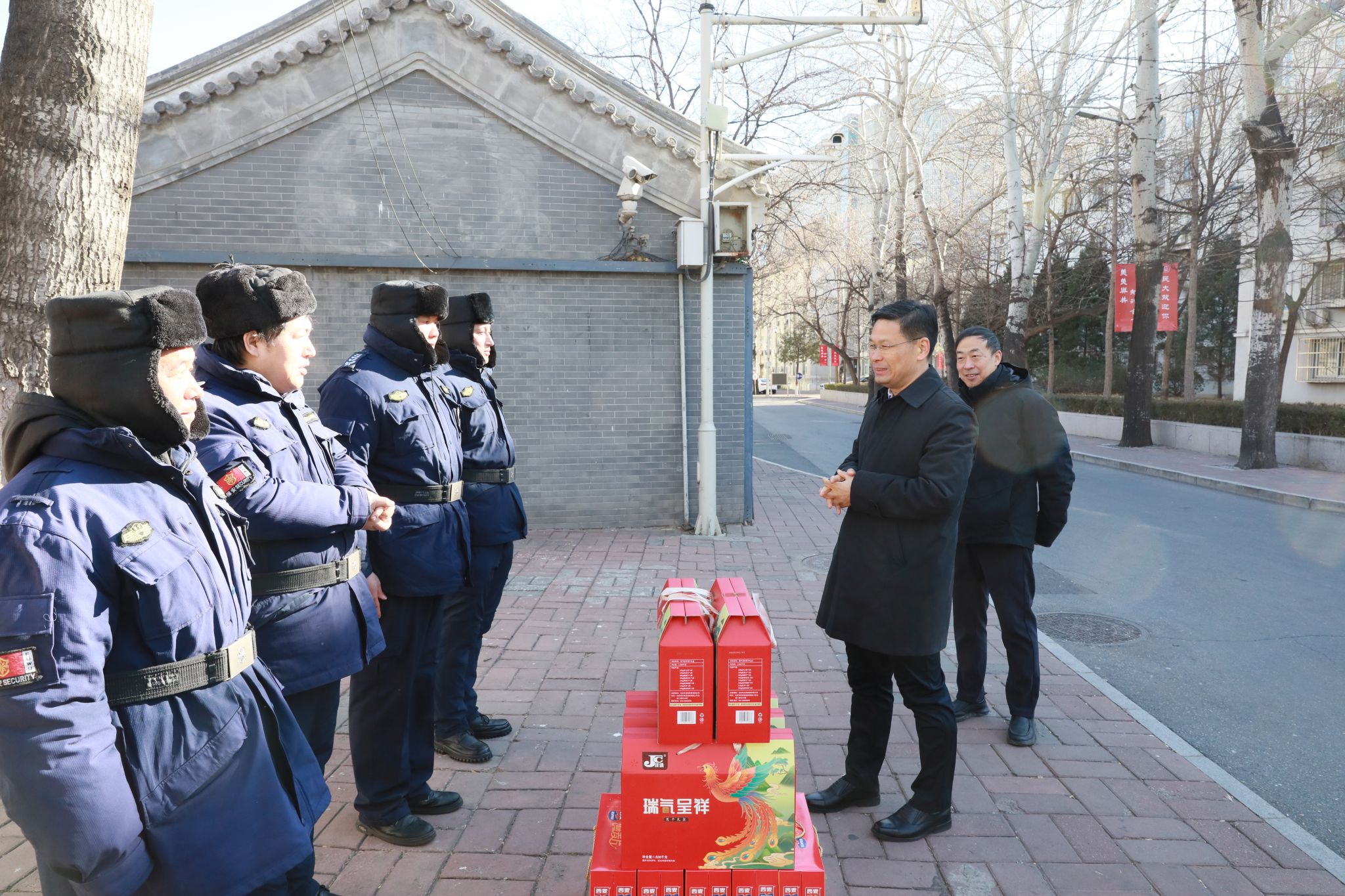 在海淀校區東門和西門,查顯友對在崗值班的保安員致以新春問候,對他們犧牲團聚機會堅守崗位表示感謝,并代表學校向他們的家人表示問候。