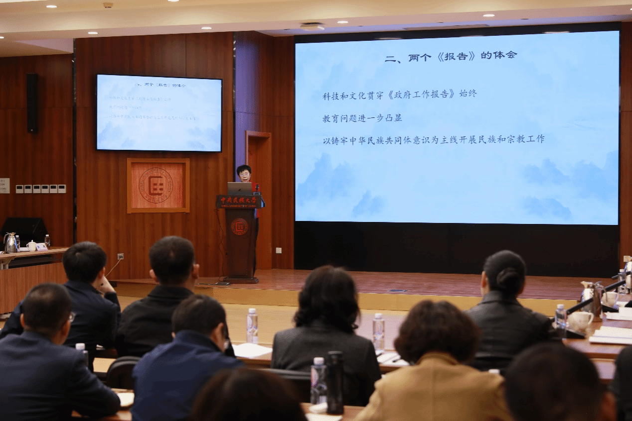 會議要求,全校上下要把學習貫徹全國兩會精神作為重要政治任務,與學習貫徹黨的二十大和二十屆二中、三中全會精神結合起來,與學習貫徹習近平總書記關于加強和改進民族工作的重要思想結合起來,與學習貫徹全國民族團結進步表彰大會精神結合起來,要充分利用好黨委理論學習中心組學習制度,結合教職工政治理論學習、“三會一課”等,緊密聯系實際,不斷鑄牢中華民族共同體意識,深化教育綜合改革、加快轉型升級,切實將學習成果轉化為服務國家戰略的實踐行動,突出落實落細、堅持善作善成,把學習成果轉化為奮力譜寫學校事業高質量發展的強大動能,為服務教育強國建設和新時代黨的民族工作高質量發展積極貢獻民大力量。