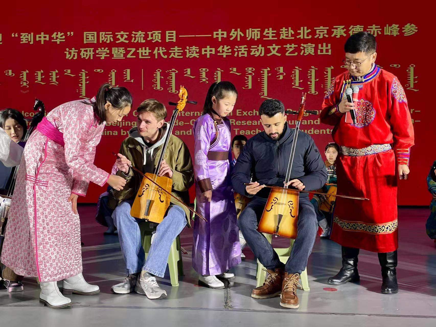馬頭琴、長調、安代舞,在巴林右旗格斯爾傳習所內,烏蘭牧騎隊員以歌舞點燃草原之夜。一段講述“三千孤兒入內蒙”的表演,觸動了不同國籍學子的心。