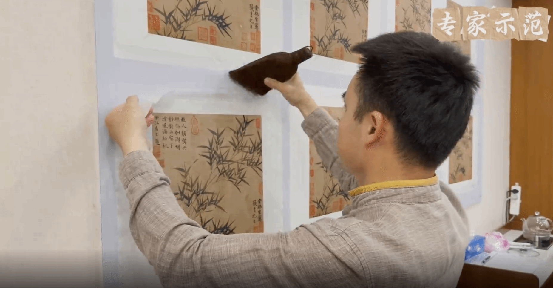 在實踐環節,劉劍輝老師邊講邊示范,帶領師生現場實操修復。他先仔細檢查字畫材質與破損狀況,隨后開始教學:用軟毛筆輕掃畫面,拂去灰塵污漬;修補時,精準挑選相近紙張,以鑷子貼合破損處,再用漿糊涂抹壓實;最后進行托裱,將托紙平整覆蓋畫心,用棕刷輕刷排氣,讓托紙與畫心緊密貼合,每一步都行云流水。現場師生目不轉睛,紛紛被這一神奇的修復過程所折服,深刻感受到古字畫修復不僅是一門技藝,更是對文化遺產的敬畏與守護。