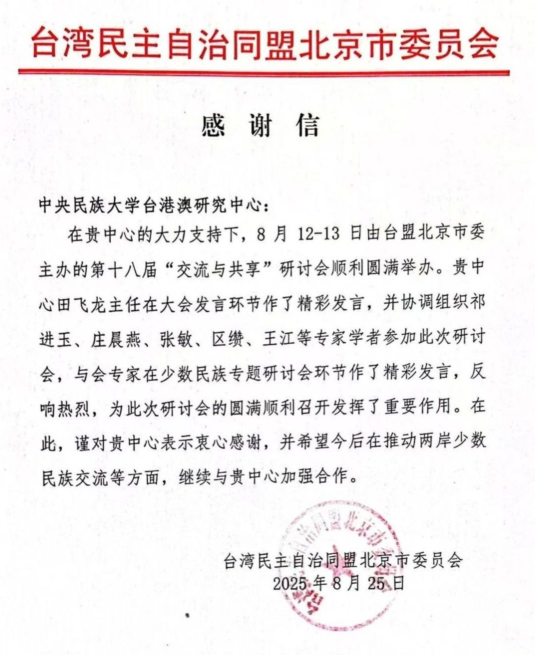 主辦方臺盟北京市委對中央民族大學臺港澳研究中心的協辦工作及民大學者的參會貢獻給予高度肯定,并表達了對繼續深化機構合作與推動兩岸少數民族交流及國家統一進程的積極意愿。