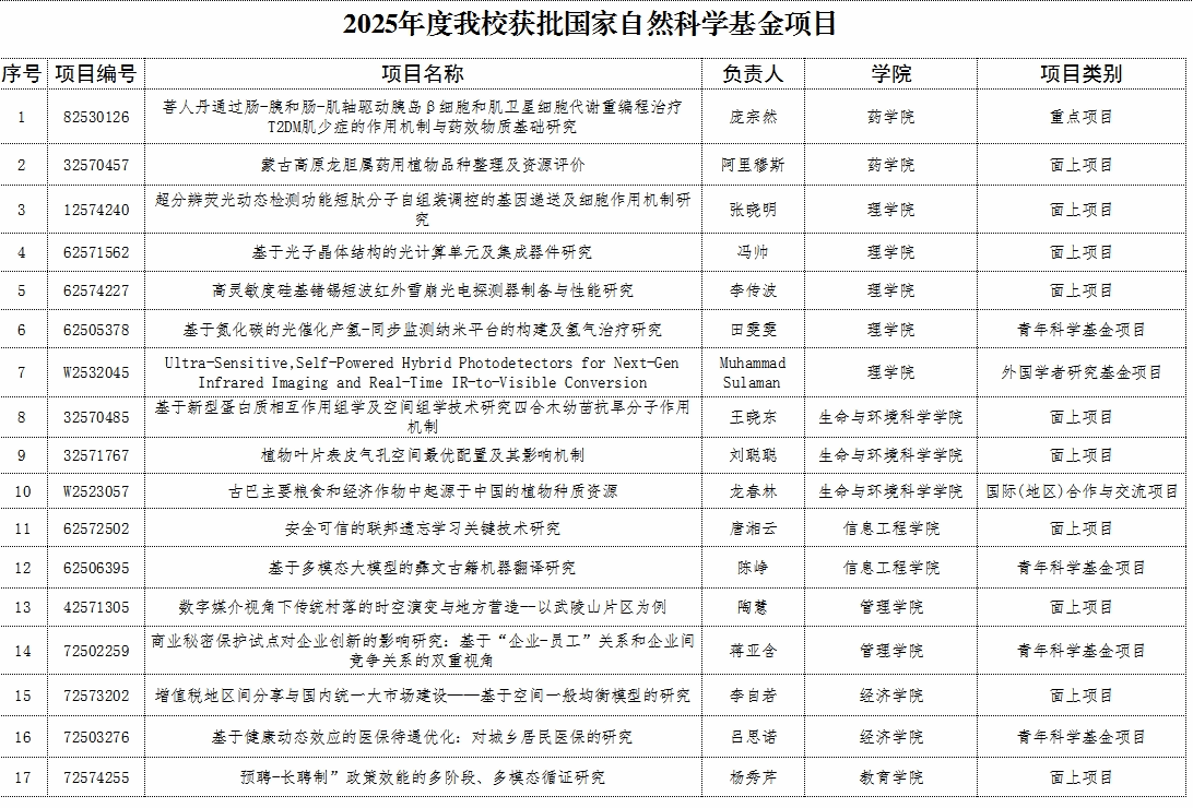 從獲批情況看,項目涵蓋多個學科領域和項目類型,項目質量有明顯提升,其中,重點項目1項、面上項目10項、青年科學基金項目4項、外國學者研究基金項目1項、國際(地區)合作與交流項目1項。從學科分布來看,生命與環境科學學院、藥學院、理學院、信息工程學院、管理學院、經濟學院和教育學院等多個單位均有項目入選,體現出學校學科協調發展和交叉研究能力的提升。其中,藥學院院長龐宗然教授主持的重點項目“菩人丹通過腸-胰和腸-肌軸驅動胰島β細胞和肌衛星細胞代謝重編程治療T2DM肌少癥的作用機制與藥效物質基礎研究”,是近三年來學校獲批的首個重點項目。