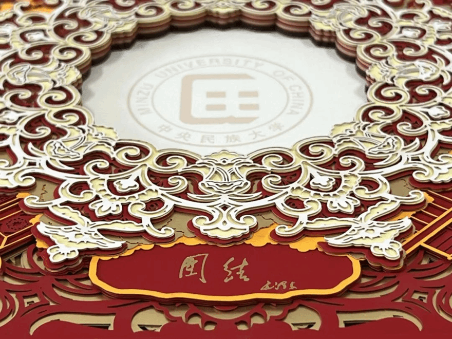 剪紙的鏤空透疊、時(shí)空寫意,借力現(xiàn)代激光雕刻,既能極致復(fù)刻紋樣精魂,又能凝練勾畫學(xué)校三校區(qū)建筑的獨(dú)特剪影。