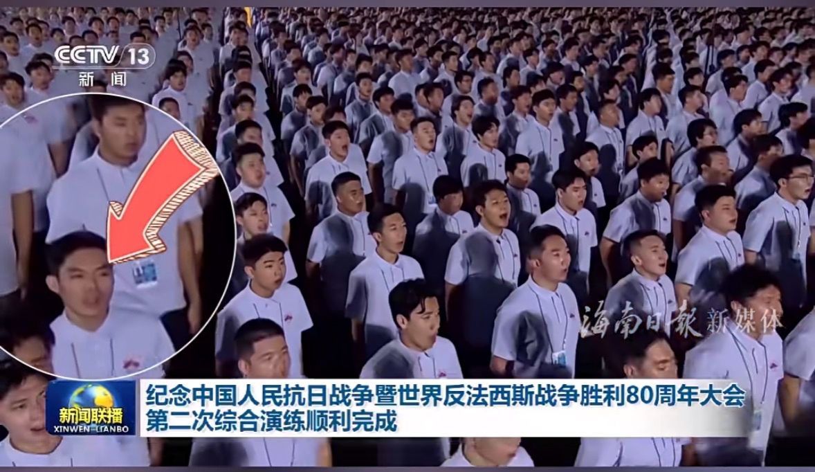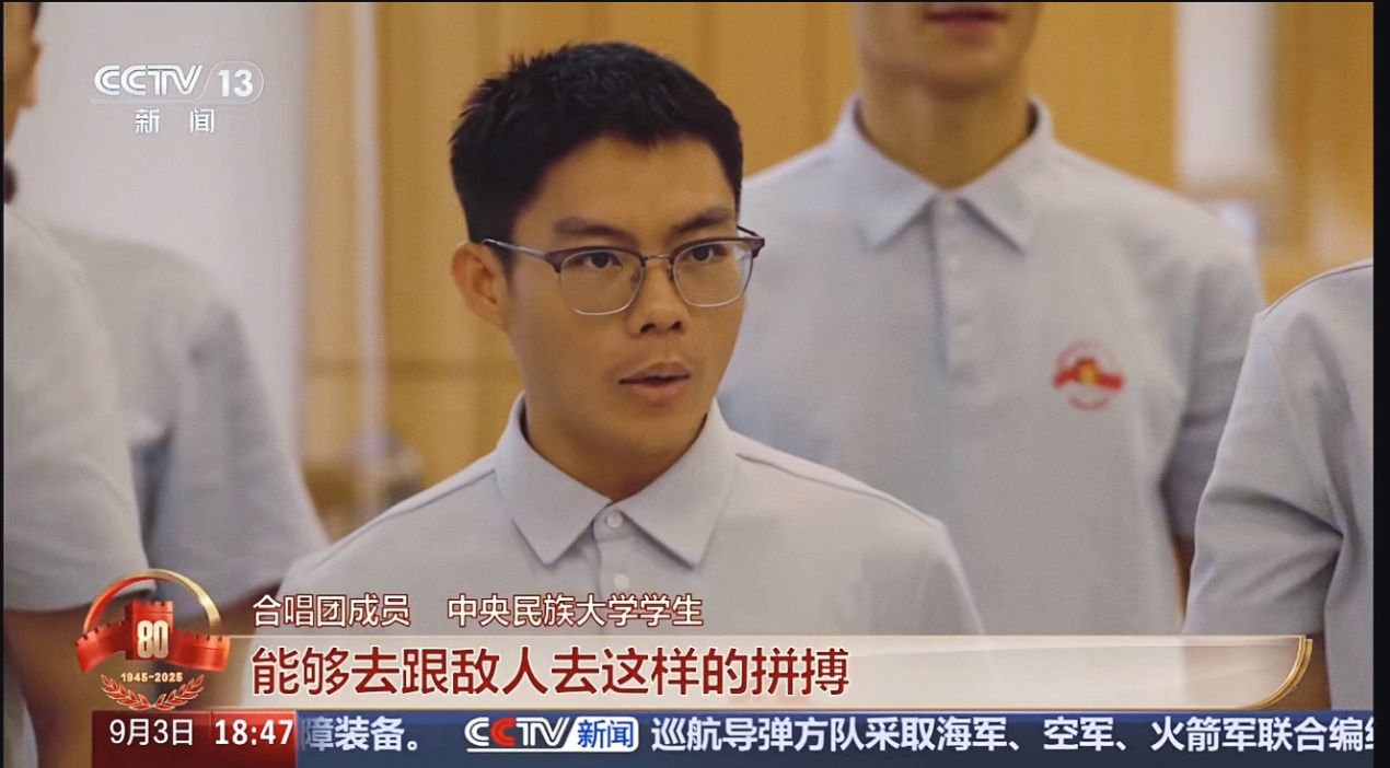 那份激動和自豪交織,在9月3日這天,讓黎灘這位來自海南革命老區的同學,緊貼祖國的心房,唱響了對祖國最深情的告白。“我們不僅在唱歌,更多的是在表達我們的家國情懷。當歌曲的旋律響起,我仿佛看見先輩艱苦抗戰的崢嶸歲月,也望見我的爺爺年輕時毅然告別家人、奔赴戰場的堅定背影。那一刻,我感到家與國、過去與現在,竟如此緊密地相連。”
