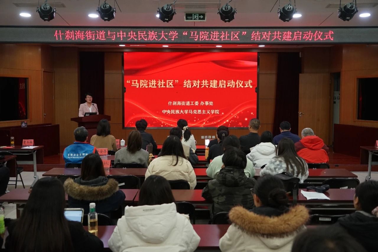 新聞網訊 為進一步推動黨的創新理論深入基層,促進高校資源與社區實踐精準對接,10月23日,中央民族大學馬克思主義學院與什剎海街道“馬院進社區”結對共建啟動儀式成功舉辦。馬克思主義學院副書記、副院長師英杰,什剎海街道工委書記陳璐,街道工委副書記、辦事處主任時磊出席活動。儀式由什剎海街道工委副書記賈冬梅主持。
