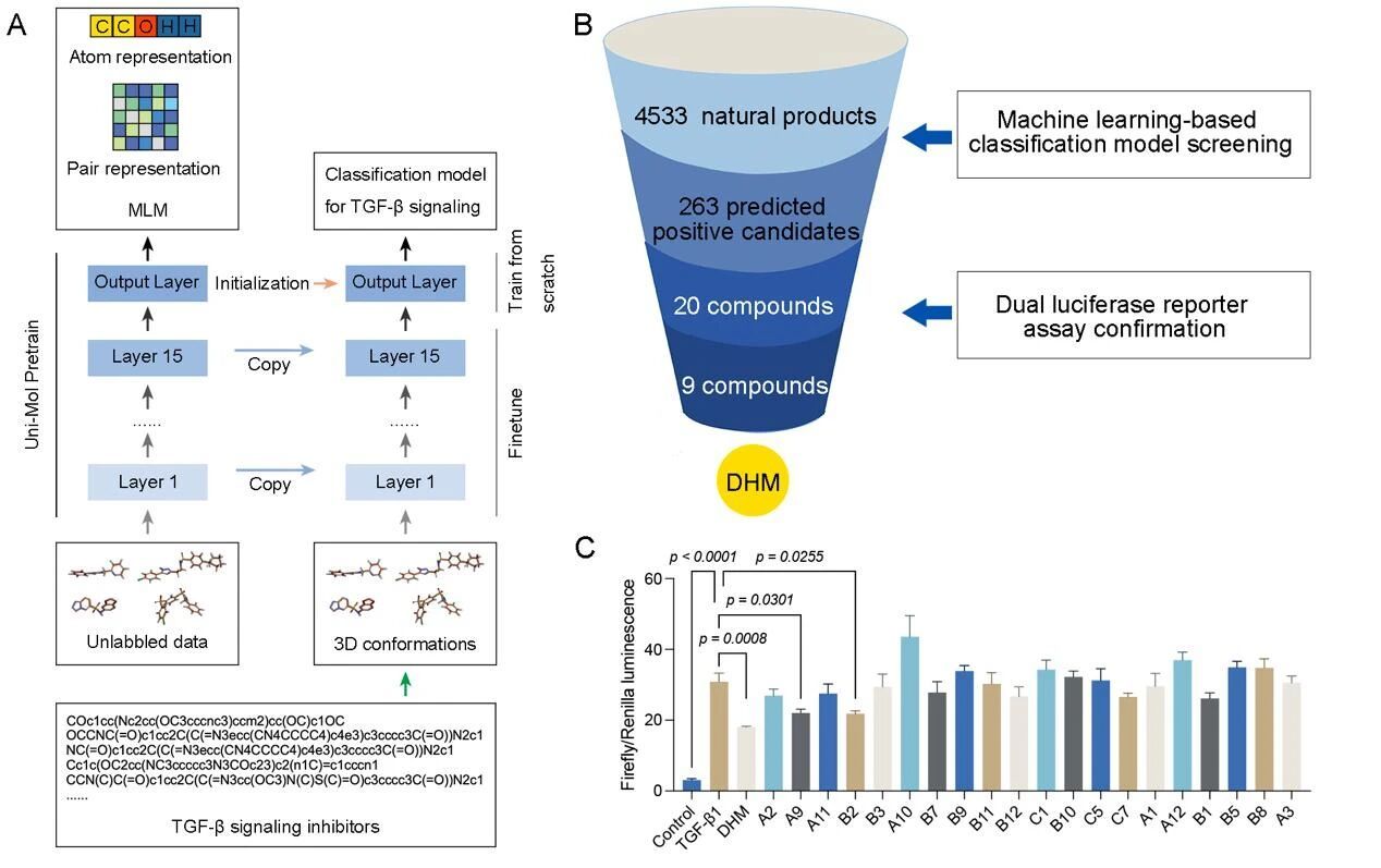 新聞網訊 10月28日,中國工程院主辦的中國科技期刊卓越行動計劃領軍期刊《Engineering》在線發表了中央民族大學藥學院王昊教授團隊與中國醫學科學院醫藥生物技術研究所游雪甫、楊信怡研究員合作的最新研究成果。中央民族大學2022級博士研究生任一鑫(共同第一作者),基于遷移學習技術,自主構建了高效的TGF-β信號通路抑制劑篩選模型,實現從4533種天然產物到9個高活性化合物的精準篩選。該研究首次揭示了天然黃酮化合物二氫楊梅素通過抑制TGF-β/ALK5信號級聯發揮作用的機制,為肺纖維化這一臨床難治性疾病的治療開辟了新型路徑。