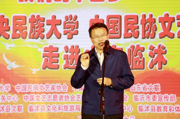 我校黨委常委、副校長石亞洲蒞臨活動,并發表講話。他指出本次活動的成功舉辦離不開中國文聯、山東省文聯、臨沂市文聯、臨沭縣文聯的大力支持,中央民族大學能夠以中國文聯文藝志愿者協會戰略合作單位的身份參與進來,出席活動的全體師生都感到十分激動,也十分榮幸。正如總書記說的“文藝的源頭活水在人民之中”,對于中央民族大學來說,此次文化進萬家活動意義重大,不僅是將新時代的文藝思想傳遞到人民中來,更是學習經典齊魯文化的好機會。